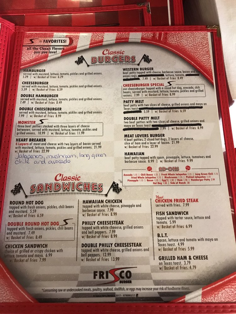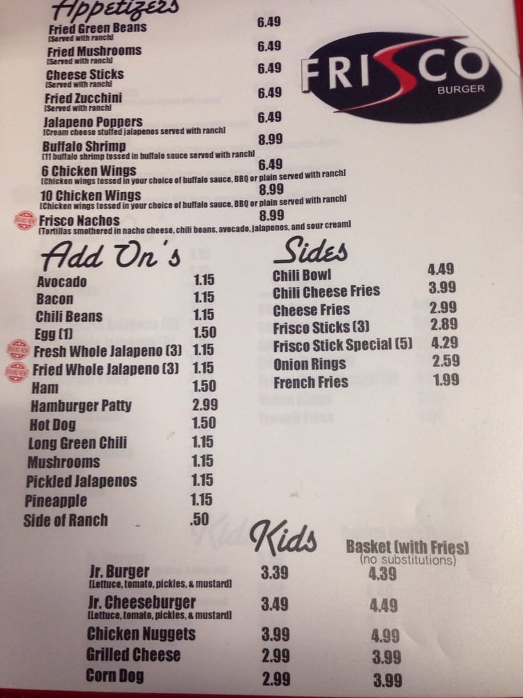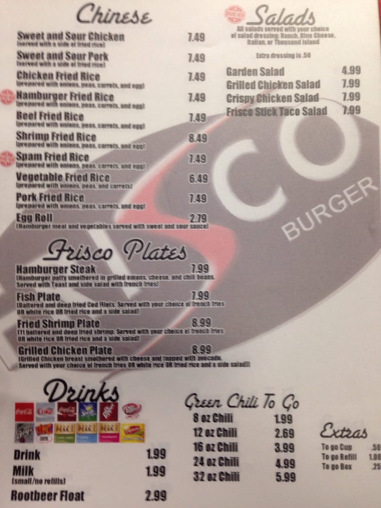 Introducing the menu at Frisco Burger, an American diner in El Paso, TX, offering a variety of options for dining in, takeout, and delivery. Customers rave about the juicy, flavorful burgers, crispy fries, and unique dishes like shrimp fried rice and Philly cheesesteak. The green salsa adds a delicious twist to the burgers, while the Frisco sticks and chicken fried steak plate are must-try items. The menu also features Asian-inspired dishes like egg rolls and sweet & sour pork, adding a multicultural touch to the classic American diner fare. The fast and friendly service, along with the nostalgic atmosphere, make dining at Frisco Burger a memorable experience. Don't miss out on the tasty offerings and giant drinks served in buckets. With a diverse menu and excellent service, Frisco Burger stands out as a top spot for satisfying comfort food cravings.